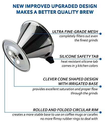 - ENJOY A BETTER BREW WITH OUR CLEVER IMPROVED DESIGN; CONE SHAPED FILTER BOASTS AN IRRIGATED BASE which provides excellent saturation and proper flow through the grinds. Plus, our NEWLY DESIGNED BASE, is now a ROLLED AND FOLDED CIRCULAR RIM which creates a more stable base to use on coffee mugs or carafes. No more flimsy rubber rings to deal with.