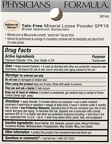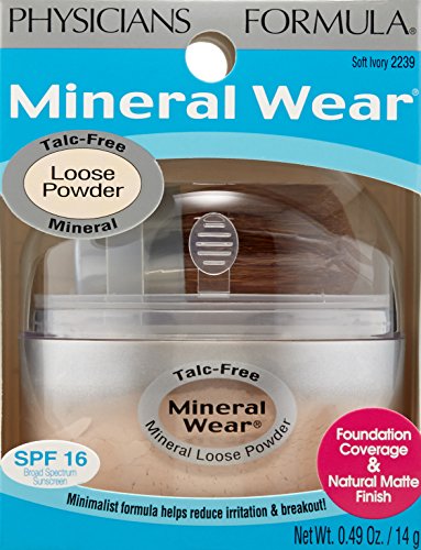 Physician's Formula mineral wear talc-free loose powder, soft ivory. The first easy to use, mess-free, mineral-based, talc-free loose powder. Available in 1 new shade. Help to protect and condition the skin. SPF 16. Talc-free. For extra sensitive or breakout-prone skin. Hypoallergenic, fragrance free, oil-free. Dermatologist approved. Non-comedogenic.Feature