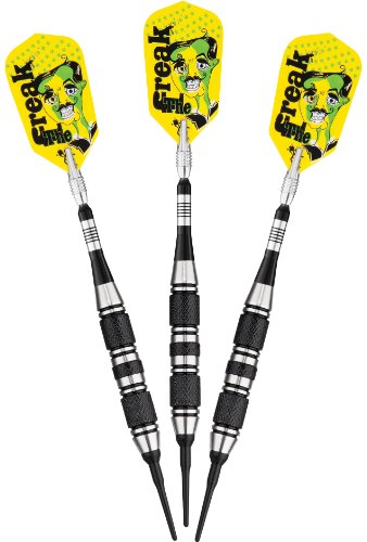 Viper The Freak soft tip darts are designed with high quality nickel silver plated barrels that provide exceptional balance and styling. Strategically placed knurling and grooves provide excellent gripping points, enhancing your control. Each dart features a Yukon Spinster aluminum shaft with a locking hole to increase tightness and improve stability. The shaft rotates upon dartboard impact, greatly reducing the chance of deflection. These darts include an additional 3 convex nylon shafts, a dart mechanic tool, 2BA Tufflex Tips II soft tip dart points and 6 high speed slim flights. These flights are specifically designed to help increase speed and reduce drag, delivering a consistent flight path and pinpoint accuracy. The 2BA Tufflex Tips II soft tip dart points have a reinforced cone that is extremely strong and durable. Simply twist for a tight, secure fitting and easy removal. Viper The Freak soft tip darts are finished off in style with hand painted rings along the barrel.