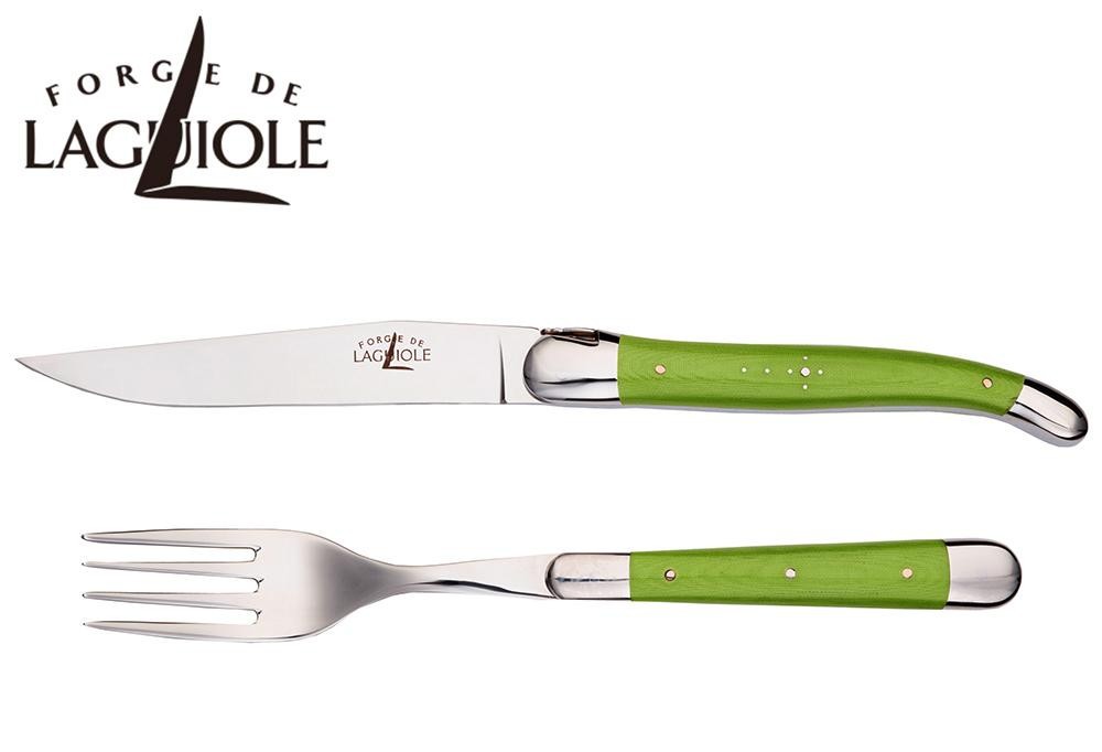 | テーブルナイフの刃はすべて鍛造されており、切れ味良くステーキ肉などを切ることができます。また、中ほどにふくらみをもたせたフォルムのハンドルは大変握り易く、適度な重量感が手の平にフィット。柄の部分は着色された布をメラミン樹脂につけ込んで圧縮した「コンプレストファブリック」を使用。耐久性にすぐれ、摩耗や変色をおこしにくくなっています。従来のライヨールにはない斬新でカラフルなデザインをお楽しみ下さい♪ |