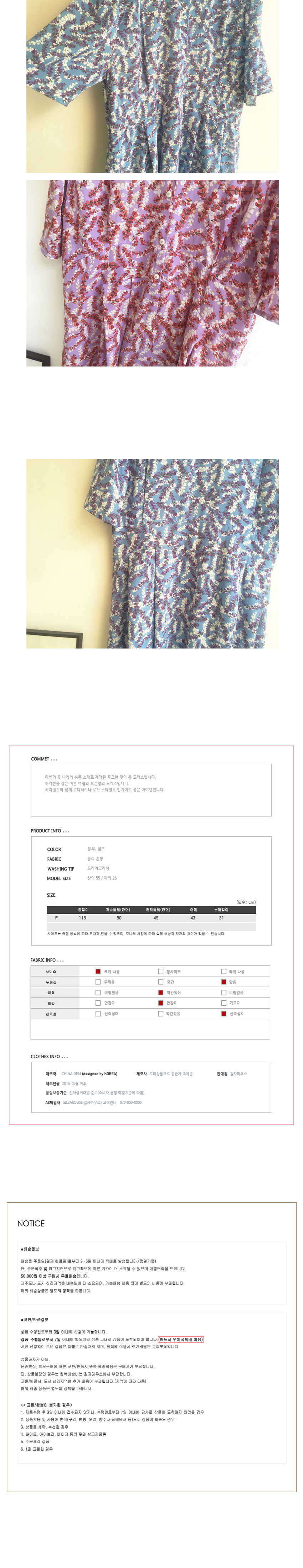 Free(단면): 가슴둘레 50cm, 허리둘레 45cm, 어깨 43cm, 소매 31cm, 총장 115cm