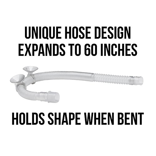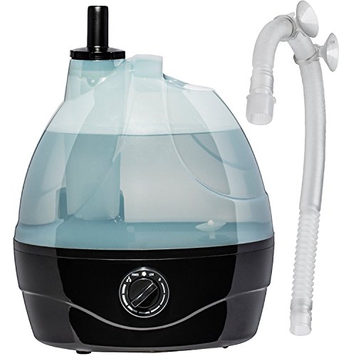 Our tank holds up to 2 liters of water (2 times most competing humidifiers) and features a no-spill valve for easy filling. Dry-run protection shuts off the device when the tank is empty. Flexible adjustable hose ranges from 1.5 - 5 feet