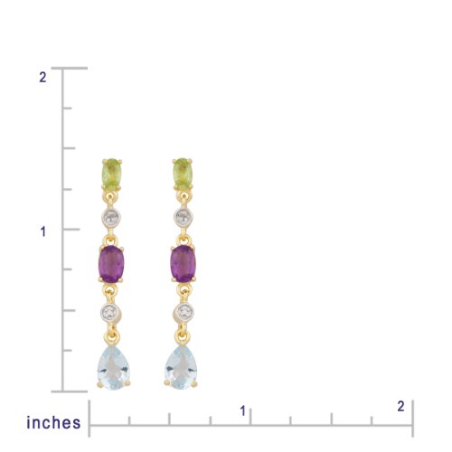 Make an elegant statement with the 18k Gold-Plated Multi-Gemstone Linear Earrings. These elongated dangle earrings are made with 925 sterling silver that has been plated with glossy 18k yellow gold. A combination of pear- and oval-shaped peridot, blue topaz, and amethyst stones are accented with diamond charms. With a total of 2.54 carats, the earrings measure 1.47 inches long for a lovely silhouette. The dangles are mounted on gold-plated post ear wires with comfortable, secure friction backs. Easy to match day and evening wear, these earrings will make heads turn wherever you wear them. Pair them with a deep-V neckline gown and a matching gemstone necklace for a chic, coordinated look.Feature
