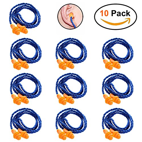 -. Feature : 10 pairs of the corded hearing protection ear plugs in one set will be sold together. / Cord color: mainly blue. Material: durable soft silicone. Cable length: about 65cm. / NRR (Noise Reduction Rating): about 25dB. / Made of soft and snug silicone for noise reduction and providing you better hearing protection. / Noise reduction for work, home, sleeping and safety. Washable and reusable design, and easy to use.