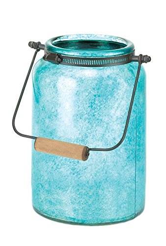 -. Feature : The country-style jar lantern is made from gorgeous blue glass. / Dimensions: 7 3/8" x 6 1/4" x 9 3/8" high 15" high with handle. / Item weight: 3.2 lbs. / Material : Iron and glass.