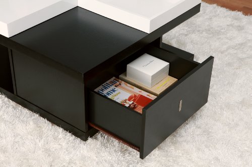 - Feature : Smart solutions coffee table includes a removable serving tray that can be used to serve beverages or as a centerpiece holder / Product is made of medium fiber board frame, laminate black finish / Square shape coffee table; 1-set of serving tray; 2-drawers with nickel hardware flip knobs; 2-open compartments for display / Assembly required by two adults; To clean, use damp cotton cloth to wipe clean; Made in China / Measures 32-inch wide by 32-inch deep by 16-inch high; 30-days hassle-free replacement parts warranty