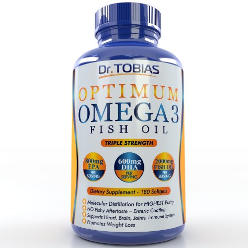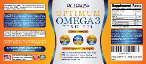-. Feature : • OPTIMUM SERIES 2,000 mg Fish Oil with 1,400 mg Omega-3 Fatty Acids (600 mg DHA, 800 mg EPA) per serving (2 caps). Get 3-4 times more of the important Omega-3s compared to many other brands. A famous TV expert calls Omega 3 the most important single supplement. With this product, you will meet his recommendation of 600 mg DHA per day - with a single serving! Fish oil supports the health of heart, brain health, joints, mood & mental state, skin & hair. / • BETTER ABSORPTION & AVOID FISHY AFTERTASTE: Our omega 3 fish oil pills have an enteric coating to help increase your absorption of the essential fatty acids and avoid fishy aftertaste. Enjoy Health Benefits Without Fish Burps! / • PURITY THROUGH MOLECULAR DISTILLATION: Dr. Tobias fish oil is tested for purity and label accuracy. Our fish oil is purified with molecular distillation - one of the few current methods that can purify from heavy metals, PCB's and other toxins to below detectable limits for human consumption. / • THIRD PARTY TESTED - For Product Purity, Projected Efficacy, Ingredient Safety, Nutritional Value, and Label Accuracy. Quality you can trust! / • 90-DAY-SUPPLY + BONUS ONLINE HEALTH VIDEOS = GREAT HEALTH VALUE! You get 180 fish oil capsules with each bottle. Bottle color may vary. Additionally, after you received your bottle, you will get free access to 25 bonus online health videos with effective exercises for your health & stress relief