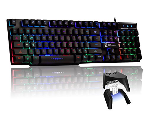 -. Feature : GAMING EMITTING CHARACTER KEYS---Specially grip coated keycaps for enhanced durability and tactile feedback, professional gaming feeling.Perfect the visibility is,illuminated keycaps help recognizing at dark room. / UNIQUE ADJUSTABLE BACKLIT DESIGN---Five level of brightness.Two Backlit Modes, Stable Rainbow and Circular Breathing Rainbow Modes. Can be on/off through ONE KEY. / MULTI OS COMPATIBLE,wired KEYBOARD--104 keys with numpad,suit to work in office OR gaming at room.Also good to the smart TV/iMac/Macbook/ps4. / IMITATE MECHANICAL KEYS&ERGONOMIC TILT DESIGN---30 angle board and arcuated Double injection ABS keycaps design, effectively reduce hand fatigue, feel more comfortable / Easy to use,plug and play.Enjoy Fast Return Service We provide 30 days money back or replacement and 12 months warranty of the quality problem.