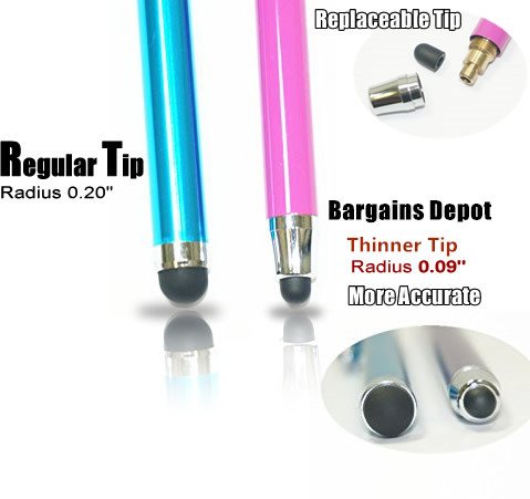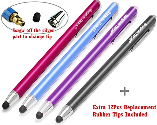 - Title : Bargains Depot® [0.18-inch Rubber Tip Series] 4Packs Stylus (Blue & Black & Purple & Pink) --- (length: 5.5", tips: 0.18"Diameter) SILM / ACCURATE / THINNER TIP Capacitive Stylus/styli Universal Touch Screen Pen for all touch screen Tablets & Cell Phones with 12 Extra Replaceable Soft Rubber Tips - 4PCS in one Package