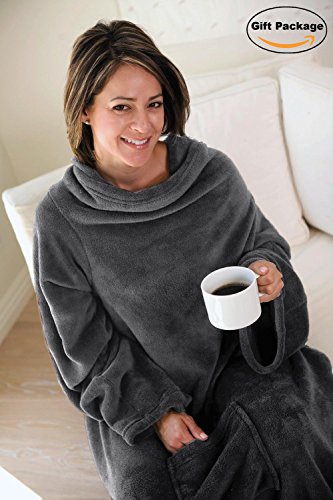 Deluxe Fleece Blanket with Sleeves and Pocket Grey, Lounging Super Soft Microplush Adult Wearable Throw Robe for Women and Men