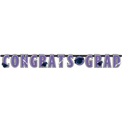 - Features spelled out headline of "Congrats Grad" in individual purple block letters, this banner is also adorned with purple stars, mortarboard and diploma embellishments