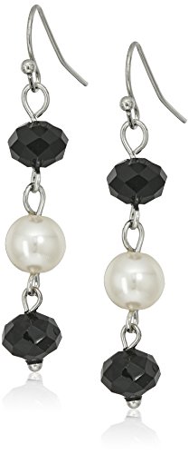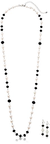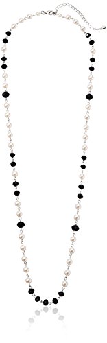 Silver Tone Simulated Cream Pearl and Jet Long Rosary Necklace, 34"