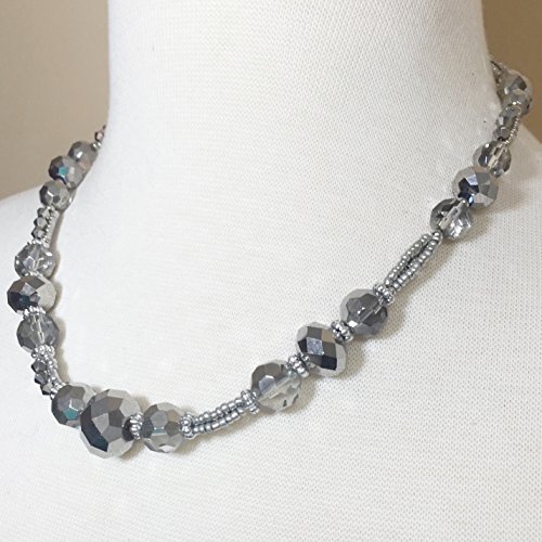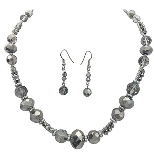 Single Strand Glass Beaded Necklace & Dangle Earrings Set (Hematite Grey Silver Tone)