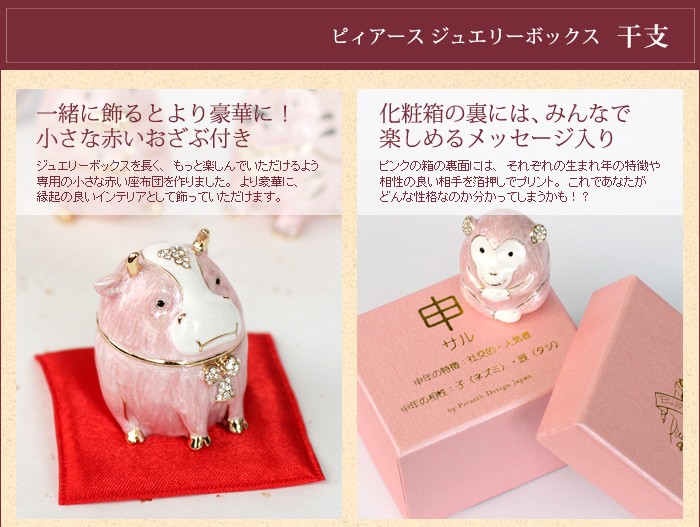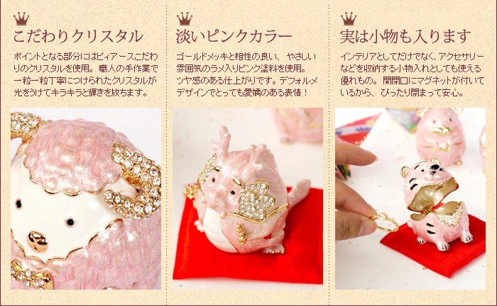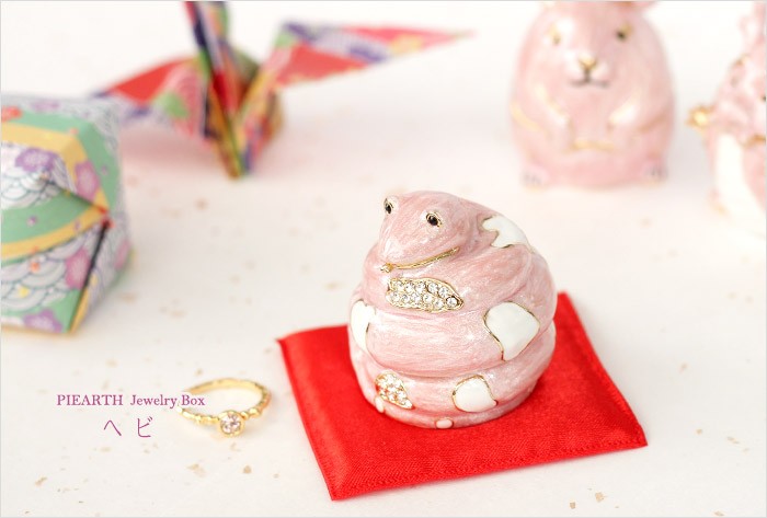 | ジュエリーボックスと言えば、指輪やピアス、ネックレスなどのアクセサリーを入れる引き出し型のケースを思い浮かべる方が多いかもしれません。 ピィアースのジュエリーボックスは、動物や花などをモチーフに作られ、合金製でずっしりとした重さがあります。また高品質のクリスタルガラスを贅沢に使用。まるでジュエリーボックスそのものが宝石のような、高級感溢れる仕上がりです。 小物入れとしても使えるように開閉口には磁石が取り付けてあり、アクセサリーなどなくしやすいアイテムの収納ができます。キラキラと美しく輝く宝石箱は、そのまま飾って楽しめるインテリア雑貨として多くの方に愛されています。 国内トップクラスのジュエリーボックスメーカーであるピィアースは、2004年ごろから本格的に宝石箱の製造を始め、現在のジュエリーボックスはなんと300種類以上。大規模展示会でもご好評いただいており、全国有名百貨店でも販売されています。 自社工場でひとつひとつ丁寧に手作りし、原型作成、研磨、加工、着色、小さなクリスタルガラスの取り付けなども全て手作業で行われるこだわりのハンドメイド品。完成後は厳しい検品の後、丁寧に梱包作業をしお客様にお届けしております。 ピィアース商品は、全国有名百貨店および全国有名宝石店チェーンにてお取り扱いいただいている高品質商品です。 ★自分へのご褒美に…コレクションして並べて飾ると、さらにかわいらしさUP! ★恋人へのプレゼント…中にアクセサリーを入れて、サプライズな贈り物として ★家族への感謝ギフト…お母さんや姉妹へ、日頃のありがとうの気持ちを込めて ★誕生日プレゼント…お友達の喜ぶ顔が見たいから、いつもと違うキラキラギフトを ★小さな女の子へ…まるでお姫様が使っているようなキラキラ宝石箱は女の子の憧れ! |