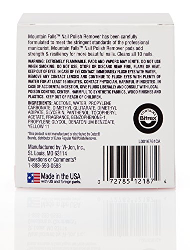 ReleaseDate : 2017-05-28 Studio : Vi-Jon Publisher : Vi-Jon Binding : Health and Beauty Product Description Don't wait for your next spa day to treat yourself. Mountain Falls Regular Nail Polish Remover Pads have been carefully formulated to quickly and gently care for your nails. The salon quality formula softens cuticles and contains Vitamin E. Our formula is free of preservatives and animal based ingredients. 0