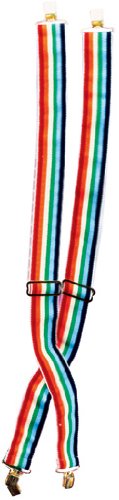 -. Binding : Apparel -. Brand : Rubie's -. Color : Multi -. Department : mens -. Feature : 1 pair of elastic suspenders / Available in yellow, black, red, green or rainbow / Adjustable, one size fits most teens and adults / 4 silver clips - attaches easily to belt or pants / Rubies' collection represents more than six decades of bringing you quality products, innovation and value for every costume occasion -. Genre : Suspenders/Belts -. IsAdultProduct : 0 -. Label : Rubies Costumes - Apparel -. Manufacturer : Rubies Costumes - Apparel -. ProductGroup : Apparel -. ProductTypeName : ADULT_COSTUME -. Publisher : Rubies Costumes - Apparel -. Studio : Rubies Costumes - Apparel -. Title : Rubie's Costume Rainbow Clown Suspenders