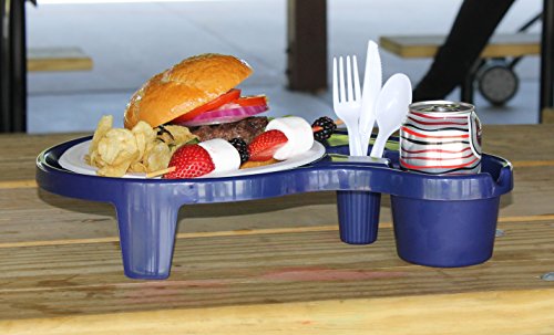 - Easily holds a standard 9" plate, plus up to a 32 oz. glass, can, bottle, or paper cup; also has a handy-dandy compartment for utensils and a napkin