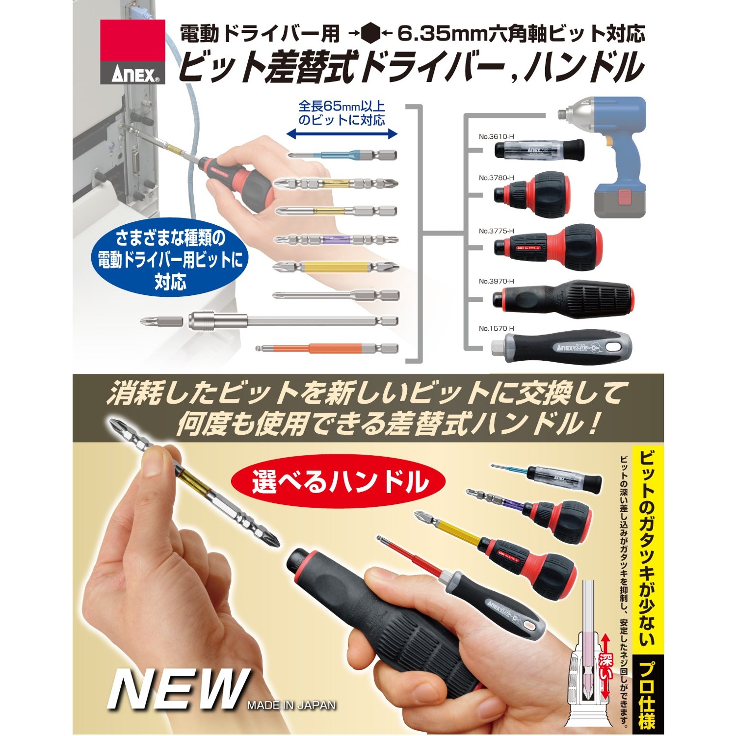Maximum diameter: 35 mm ● Bit for electric screwdriver Available: Bits with hexagonal axis of 6.35 mm, total length of 65 mm or more ● Note: Do not use bits less than 65 mm in total length.