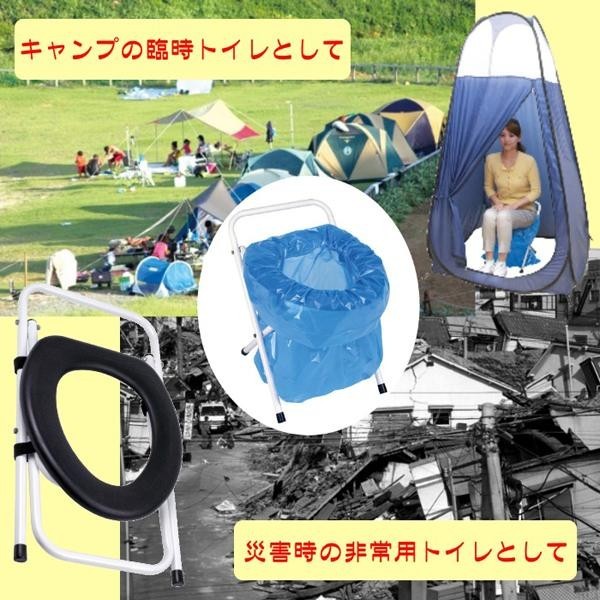 アウトドア、レジャーや非常用、災害時の断水時にご使用いただけるおすすめの折畳み簡易便座です。コンパクトに折畳めるので持ち運びや移動、収納に手軽で最適です。ポリ袋を取り付ければ、即ご使用いただけます。トイレがないキャンプなどのレジャーや田畑の作業中などの急な用足しにも活躍します。非常時、災害時にもトイレは必要不可欠。いざという時のために、普段から備えておきたい商品です。 |
