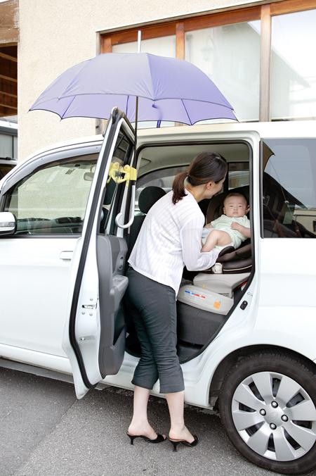 窓の内側に吸盤で取り付けるだけですので手間がかかりません。傘の芯を押し込むだけで簡単に固定できますので、両手が使えて雨の日のお子様の乗せ降ろし等に便利です。 |