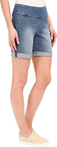 Pull-on short has a higher rise and relaxed fit. Wide elastic waistband offers an easy fit and smooth silhouette. No dreaded muffin top in these shorts! 10.8 oz stretch comfort denim fabrication. Five-pocket design sports signature 'j' embroidery on the back. Rolled cuffs. Stitched outline of a brand patch and small tag at the back waist. Faux fly. 77% cotton, 21% polyester, 2% spandex. Machine wash cold, tumble dry low. Imported.
