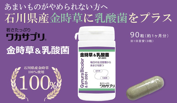 あまいものがやめられない方へ石川県産金時草に乳酸菌をプラス≪ワカサプリVitaminC人気の理由≫【加賀野菜・金時草】葉の赤紫色部分にアントシアニンが豊富に含まれており、 他にもビタミンA、ビタミンC、カルシウム、ギャバなども豊富に含まれています。金時草 & 乳酸菌(EF-2001)は、3粒で468億個の乳酸菌を補うことができます。【乳酸菌(EF-2001)配合】EF-2001は、乳酸菌の中でも高い健康効果を持っており 金時草 & 乳酸菌(EF-2001)は、3粒で468億個の乳酸菌を補うことができます。【植物性ハードカプセル(HPMC)】物性のハードカプセル「HPMCカプセル」を使用していますので胃の中で溶けやすく、ゼラチンアレルギーの心配がありません。【国内GMP認定工場で製造】厳しい品質管理・製造管理のもとで、安全性や品質が確保された 国内の工場で製造しています。