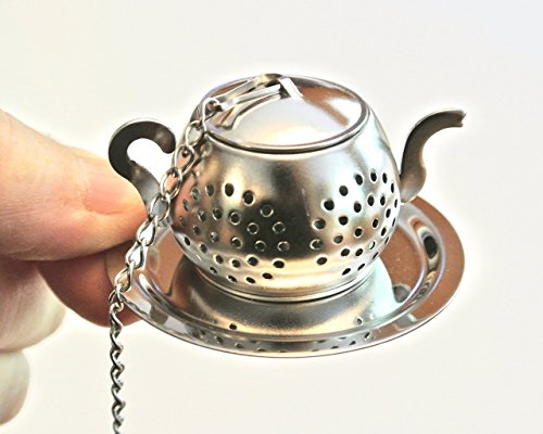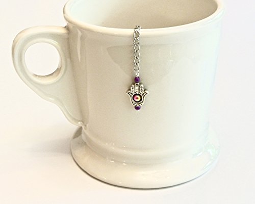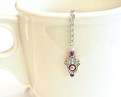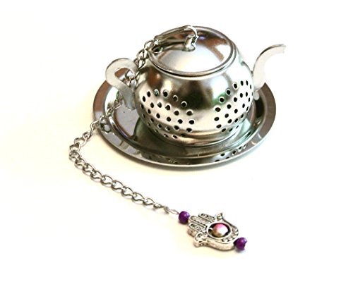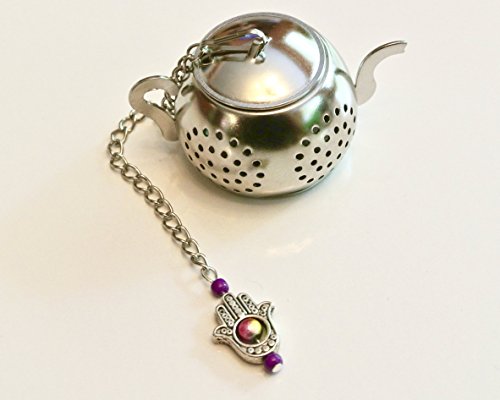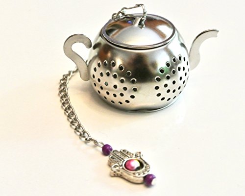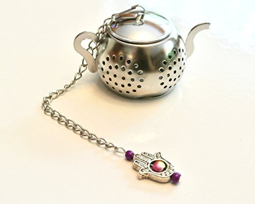 Product Description Add a little charm to your tea brewing or mad hatter tea party with this teapot shaped tea infuser decorated with pewter hamsa hand charm and gorgeous beads. You'll have a special detail on the outside of your cup to match your enjoyment of what's inside!