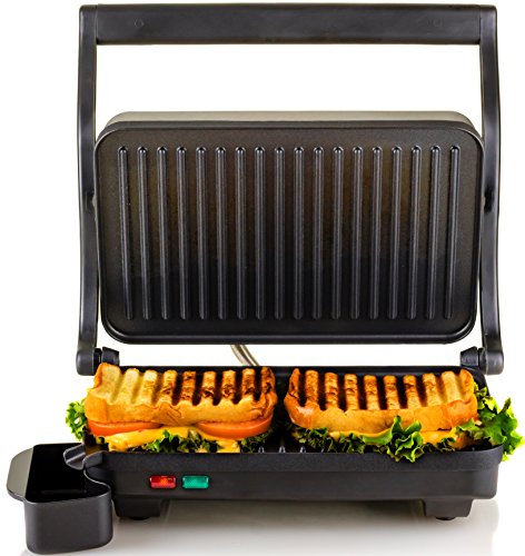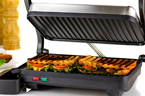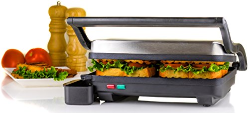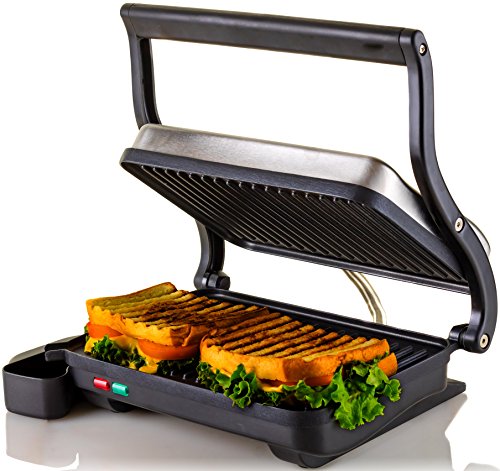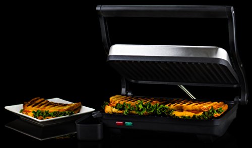 Ovente's Stainless Steel Electric Gourmet Panini and Sandwich Maker makes grilling virtually foolproof!The 2-slice 10.2 x 6.7" non-stick coated plates quickly and evenly heat up your food with 1000-watts of power so there's no need to flip it, or even watch over it. It comes equipped with Auto Shut-Off technology which turns the grill off when your food is ready. It also has 2 illuminated indicator lights; red tells you that it's preheating and green tells you it's ready to cook. The floating lid allows for versatility of foods you can grill with this handy tool. From melty grilled cheese sandwiches to juicy ribeye steaks-this grill does it all!