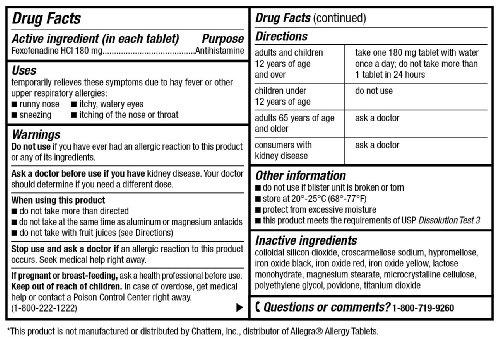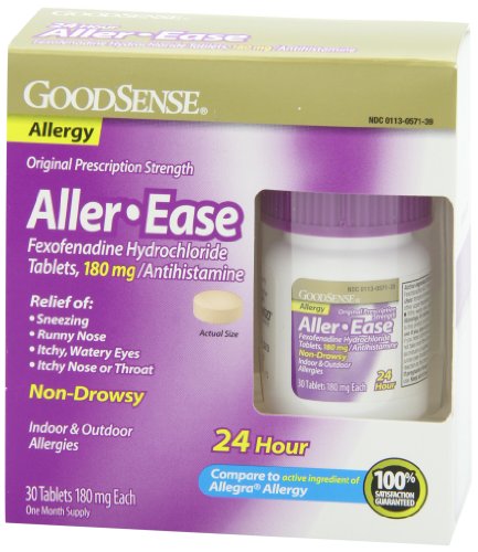 -. Binding : Health and Beauty -. Brand : Good Sense -. EAN : 0301130571393 -. Feature : Compare to active ingredient in Allegra Allergy / Temporarily relieves these symp due to hay fever or other upper respiratory allergies: runny nose; itchy, watery eyes; sneezing; itching of the nose or throat / Non-Drowsy / Indoor & Outdoor Allergies / Original Prescription Strength -. IsAdultProduct : 0 -. Label : Good Sense -. Manufacturer : Good Sense -. Model : Good322551 -. MPN : Good322551 -. NumberOfItems : 1 -. PackageQuantity : 1 -. PartNumber : Good322551 -. ProductGroup : Health and Beauty -. ProductTypeName : HEALTH_PERSONAL_CARE -. PublicationDate : 2013-05-01 -. Publisher : Good Sense -. Size : 30 Count -. Studio : Good Sense -. Title : GoodSense Aller-Ease Fexofenadine Hydrochloride Tablets, 180 mg/Antihistamine, 30-count -. UPC : 301130571393