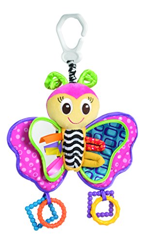: Meet the cute and delightful Blossom Butterfly! With a range of colors and textures for visual and tactile development this baby toy is lots of fun for any baby! Blossom Butterfly has crinkle sounds in the wings, an added mirror feature for fun peek-a-boo play, plastic hanging rings for teething relief and a whistling sound when she bounces. Very easy to take along with you in the pram, stroller or car seat, Blossom Butterfly features an easy C-clip attachment to keep her secure whilst on the go!Feature