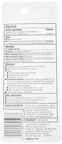 Coppertone tattoo guard stick SPF 50 is a UVa/UVb sunscreen that helps protect against uv rays that can fade or blur tattoos. Stick perfect for precise, spot application. Moisturizing formulas help maintain smooth appearance of tattooed skin. Antioxidant-rich stick formula with vitamins C and E. Photostable, broad spectrum UVa/UVb protection. Hypoallergenic and dermatologist tested. Water resistant (80 minutes) and broad spectrum protection.Feature