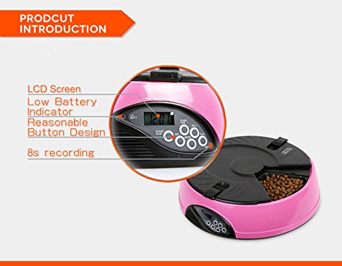 Specifications: Product Name: Automatic Pet Feeder Material: ABS plastic Color: Yellow;Pink; Blue;Yellow Capacity: 1980ml(330ml/ Compartment) Certification: CE/RoHS Dimensions: Φ12.8 * 3.6 inch Power supply: 4 x "C" Size Alkaline Batteries (not included) Package include: 1 x Automatic Pet Feeder; 0 |