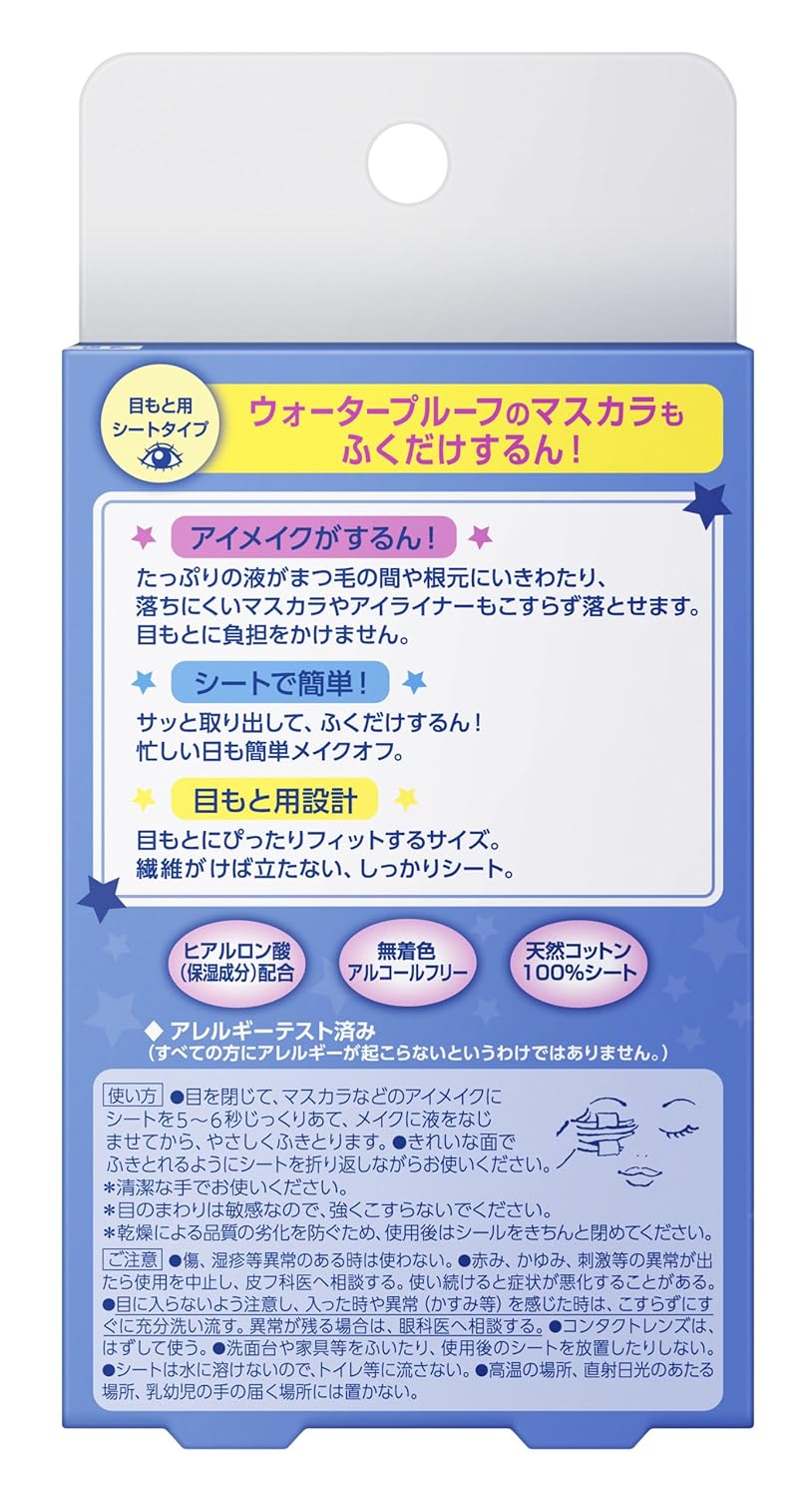 ウォータープルーフのマスカラもふくだけでするんと落として、目もとに負担をかけないシートタイプのアイメイク落とし。