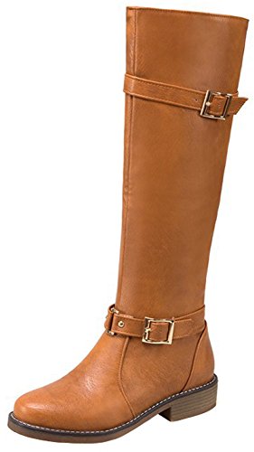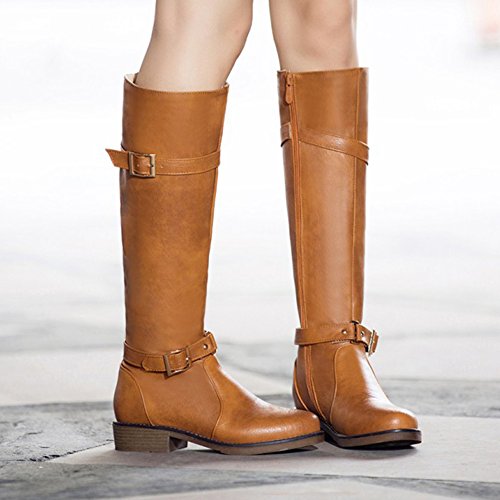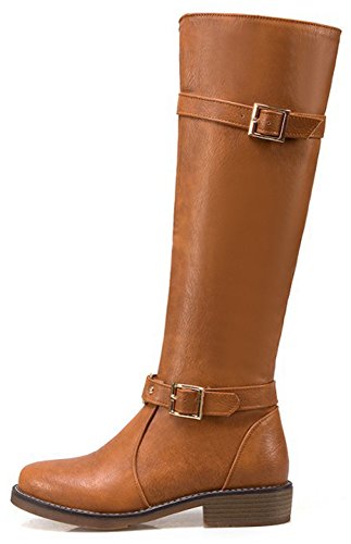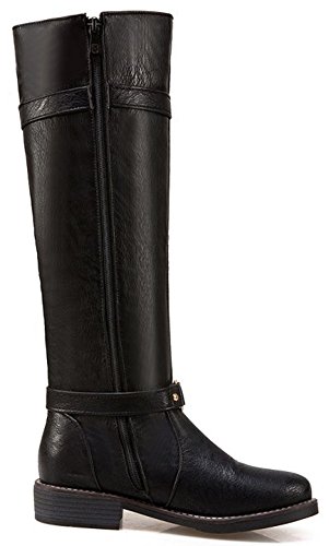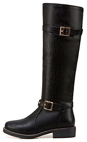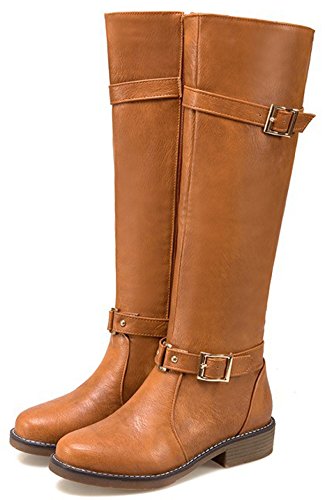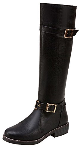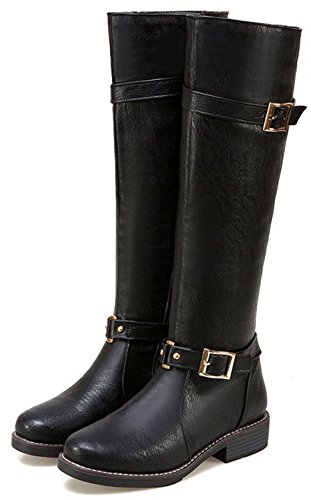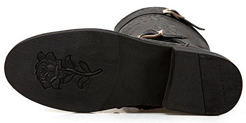 (Mofri)/Women's/Boots/DIRECT FROM USA/Mofri Women's Stylish Buckled Belt Block Low Heel Side Zipper Round Toe Mid Calf Riding Boots