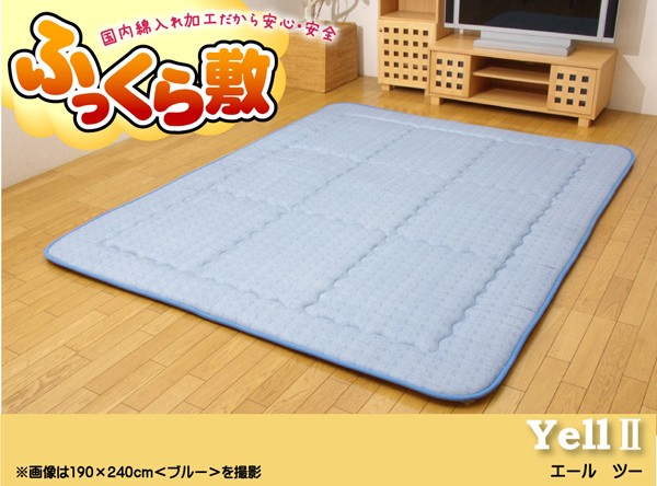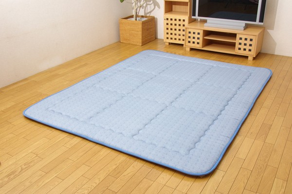 【商品名】 国産(日本製)固綿40mm使用 綿プリント ふっくら敷 『エールツーF敷』 ブルー 190×190cm 正方形 【ジャンル・特徴】 オールシーズン使えるふっくらカーペット(遮音特級LL-30) ■サイズ・色違い・関連商品■約190×190cm[当ページ]■約190×240cm■約180cm丸 ブラウン■約190×260cm ブルー関連商品の検索結果一覧はこちら 綿素材のふっくらボリュームタイプのカーペットです。綿は繊維の中でも特に肌触りが良いのが特徴で、季節を問わずご使用頂けます。中材にはクッション性にこだわった国産の固綿40mmを使用しています。十分な弾力性があるのでフローリングでのご使用にも最適です。遮音特級LL-30を取得しています。床下への騒音も軽減します。また、こたつと併用するとこたつの熱を床下へ逃しにくくなるので省エネ効果もあります。■商品スペック【サイズ】約190×190cm【素材】表地=綿100% 裏地=ポリエステル80%、綿20%(すべり止め付き) 中材=ポリエステル100%【国産固綿40mm】【原産国】日本製(側=中国製 最終加工=日本)【洗濯表示】3