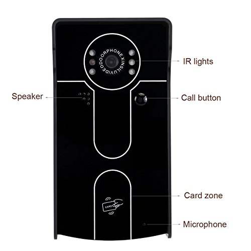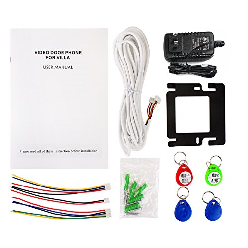 -. Feature : 7 inch TFT 16:9 color LCD display monitor and 6 pcs IR lights supports see and speak with all visitors; IR (infrared) LED projection provides clear vision of visitors even in the darkness of night / Thin design of Indoor monitor has with aluminum alloy shell acrylic panel, which also with Little rain and oxidation-proof protects from the elements / Comes with 4 RFID key fobs, one add card, one delete card, two ID card / Ringback function: an audible indication what is heard on the outdoor monitor when the guest pressing the doorbell,the sound like"du du" / Hands-free intercom; Electronic control lock; Outdoor monitoring; Support add up to 500 ID cards
