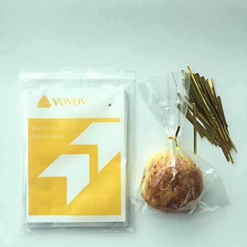 VOVOV 200x 6x8” Clear Flat Cello / Cellophane Treat Bags Good for Bakery, Candle, Soap, Cookie – 1.2 Mil Thick – 200x 3.5” Gold Colored Twist Ties