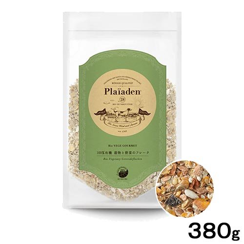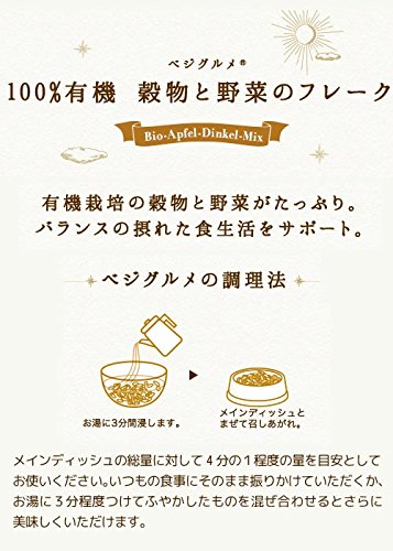原材料:〈高品質原材料〉有機トウモロコシフレーク 40.0%、有機スペルト小麦フレーク 20.9%、有機カラス麦フレーク 28.5%、有機スペルト小麦ポップ 1.9%、有機キビポップ 1.5%、有機コメポップ 1.2%、有機ニンジン 1.3%、有機ココナッツ 0.4%、有機リンゴ 0.7%、有機プラム 0.4%、有機アプリコット 0.4%、有機ジャガイモ 0.1%、有機ビートルート 0.1%、有機ホウレン草 0.1%、有機ポリ 0.1%、有機セロリ 0.01%、有機亜麻仁油 2.0%、有機キクイモ濃縮物 〈成分値〉粗タンパク質 11.6%、粗油脂 3.9%、粗繊維 4.6%、粗灰分 4.7% 内容量:380g