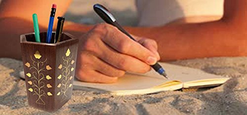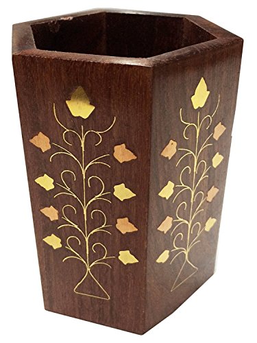 - Pen holder is hand carved with flower Inlay design work out of white wood with beautiful stripes of Sheesham wood, exquisitely crafted by skilled artisans from Saharanpur India.