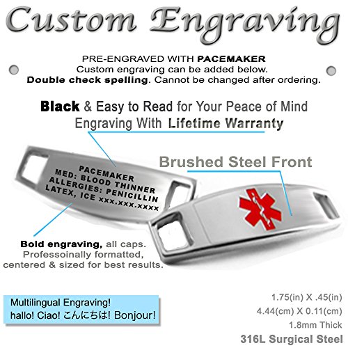 -. Binding : Jewelry -. Brand : My Identity Doctor -. Department : womens -. Feature : BLACK EASY TO READ: #1 Recommended black engraving for your life safety with Warranty (see photos) / CUSTOM & PRE-ENGRAVED: Customize ID before checkout. Also pre-engraved with PACEMAKER / IMPORTANT: Check spelling, phone numbers & grammar when ordering. Cannot be changed or redone / SIZING: Medical ID bracelet sized to fit wrist size of 7in/17.8cm or smaller. Can be resized locally / High quality hypoallergenic surgical 316L steel; Links .7cm ID 4.3cm x 1.1cm, Free ID card Incld -. Label : My Identity Doctor -. Manufacturer : My Identity Doctor -. Model : NQ-PT4L-R86N -. MPN : NQ-PT4L-R86N -. PackageQuantity : 1 -. PartNumber : NQ-PT4L-R86N -. ProductGroup : Jewelry -. ProductTypeName : FASHIONNECKLACEBRACELETANKLET -. Publisher : My Identity Doctor -. Studio : My Identity Doctor -. Title : MyIDDr - Pre-Engraved & Customizable Pacemaker Medical Bracelet, Medic ID Card Incld
