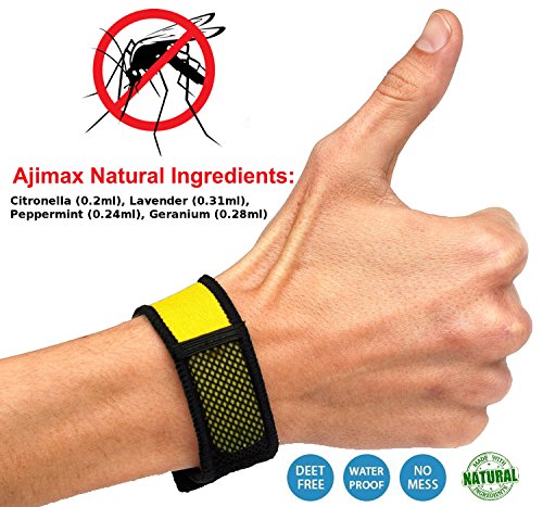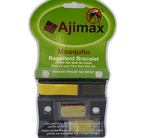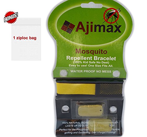 -. Brand : Ajimax -. Color : Yellow -. EAN : 0635833219376 -. Feature : ✔ MADE WITH QUALITY MATERIAL: Manufactured with high-quality and comfortable fabric. / ✔ NO SPRAY TECHNOLOGY: No more having to spray yourself or your loved ones. / ✔ PEST REPELLER WITH NATURAL INGREDIENTS: 4 Essential Oils -Citronella (0.2ml), Geranium (0.28ml), Peppermint (0.24ml), Lavender (0.31ml) / ✔ 2 FREE REFILLS: Comes with 2 refills for 30 days or more. / ✔ OUTDOOR PROTECTION: Worried about going outside because of the insects? -. Label : Ajimax -. Manufacturer : Ajimax -. PackageQuantity : 1 -. ProductGroup : Lawn & Patio -. ProductTypeName : OUTDOOR_LIVING -. Publisher : Ajimax -. Size : 5 x 2 x 9 inches ; 1.6 ounces -. Studio : Ajimax -. Title : Mosquito Repellent Bracelet By Ajimax, with 2 Free-refills 1 Bonus Ziploc Bag No-spray, No-liquids, No-mess, No-deet, 24hr Protection for Everyone Against Insect Bites -. UPC : 635833219376