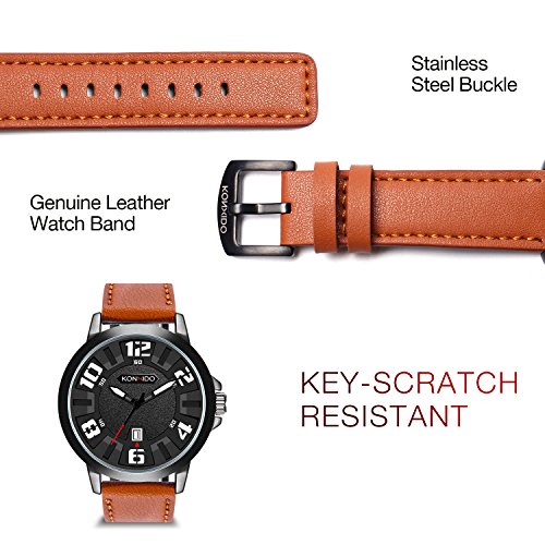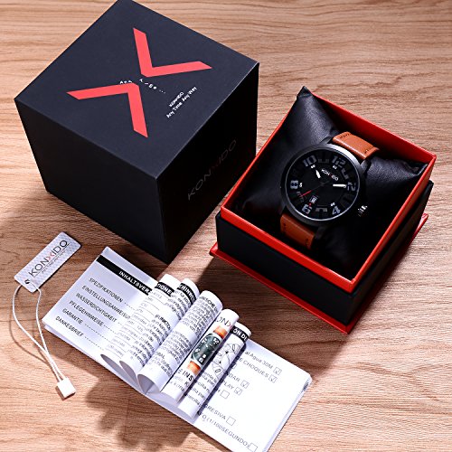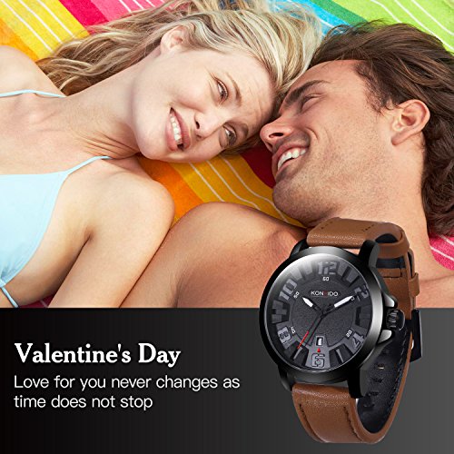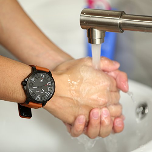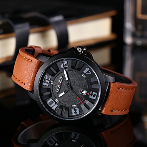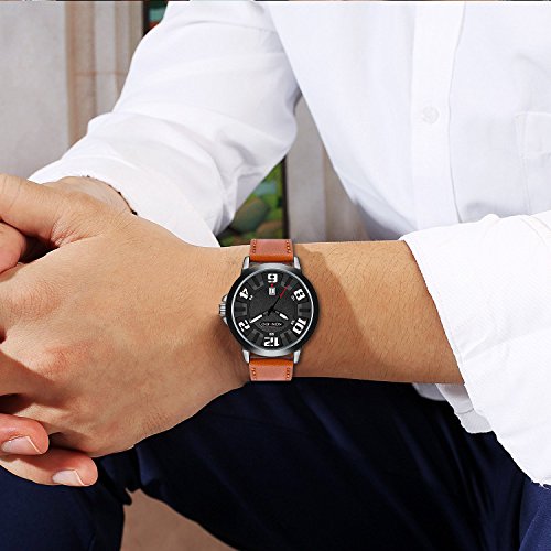3.Classical Casual Looking: coffee watchband, black case, black wave pattern dial,simple light orange hour markers, perfect for every occasion like businss,outdoor and daily use