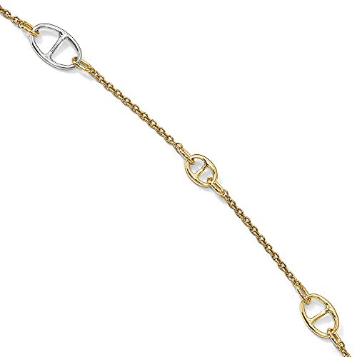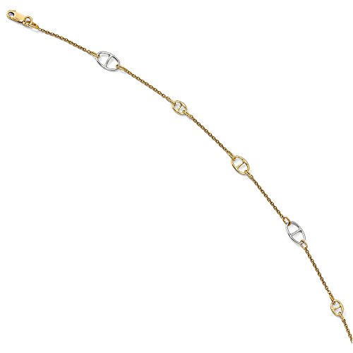 -. Binding : Jewelry -. Brand : The Black Bow -. Color : Yellow -. Department : womens -. Feature : Two tone 14k yellow and white gold / Approximate width 7.25mm / Length 10-inches / Average item weight is 2.99 grams / Includes our custom gift box -. Label : The Black Bow -. Manufacturer : The Black Bow -. Model : A8638 -. MPN : A8638 -. NumberOfItems : 1 -. PackageQuantity : 1 -. PartNumber : A8638 -. ProductGroup : Jewelry -. ProductTypeName : FINENECKLACEBRACELETANKLET -. Publisher : The Black Bow -. Studio : The Black Bow -. Title : 14K Two Tone Gold Cable and Anchor Link Anklet, 10 Inch
