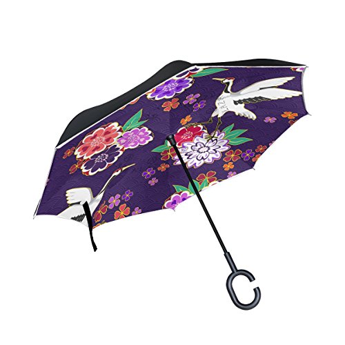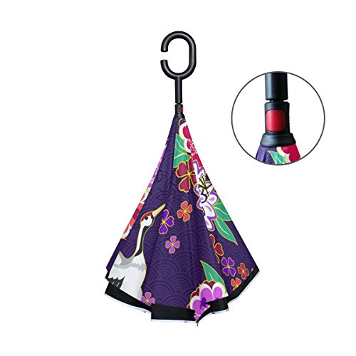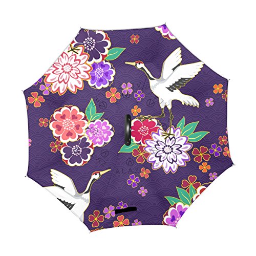 (LAVOVO)/Accessories/Umbrellas/DIRECT FROM USA/LAVOVO Retro Crane Floral Pattern Inverted Double Layer Windproof Straight Umbrellas Inside-Out...