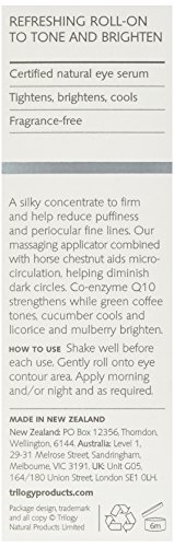 Combining a mixture of botanicals, oils and natural ingredients including Co-enzyme Q10, this natural roll-on from Trilogy provides an eye lift by combating tired, puffy eyes. Filled with antioxidants and vitamins this potent concentrate reduces the appearance of dark circles whilst cooling and toning the skin. Its refreshing, massaging application helps brighten and revitalise ageing or dull skin, resulting in fresh, younger looking eyes. Ingredients: Aqua (Purified Spring Water), Cetearyl Olivate & Sorbitan Olivate, Prunus Amygdalus Dulcis (Sweet Almond) Oil, Jojoba Esters, Ubiquinone (Co-enzyme Q10), Hyaluronic Acid (Sodium Hyaluronate), Glycyrrhiza Glabra (Liquorice) Root Extract, Horse Chestnut Extract, Coffee Seed Extract, Cucumis Sativus (Cucumber) Extract, Ormenis Multicaulis (Chamomile Flower) Oil, Camilla Oleifera (Green Tea) Leaf Extract, Olea Europaea (Olive) Oil, Oenothera Biennis (Evening Primrose) Oil, Calendula Officinalis Flower Extract (and) Gl, Rosmarinus Officinalis (Rosemary) Leaf Extrac, Glycerine, Xanthan Gum, Phenoxyethanol, Ethylhexylglycerin Made with natural and sustainable ingredients, all of Trilogy's products are formulated without parabens, synthetic perfumes and sodium lauryl sulphate Trilogy products do not contain animal-derived ingredients, except for honey and beeswax, and are not tested on animals. 7.5mlFeature