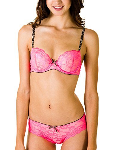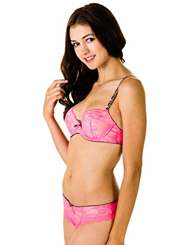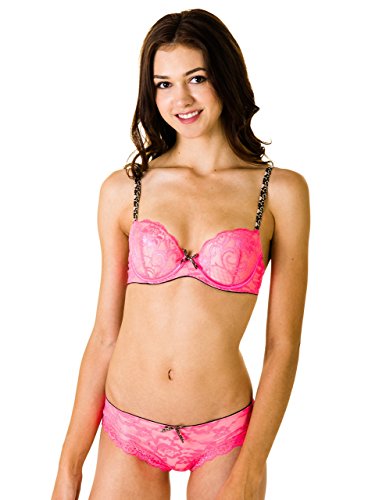 This sexy set is bound to make you feel hot. It is a push up bra with a cheetah strap bra and lace overlay. The hipster panties with a sheer lace back completes the set. Model wears a Medium: Waist: 26, High Hip: 32, Hip: 36.5 Thigh: 20.5 Specs(Measurements taken across hip; for best fit please be sure yours fall within) Small:26-32" Medium:28-34" Large:30-36" X-Large:32-38"Feature