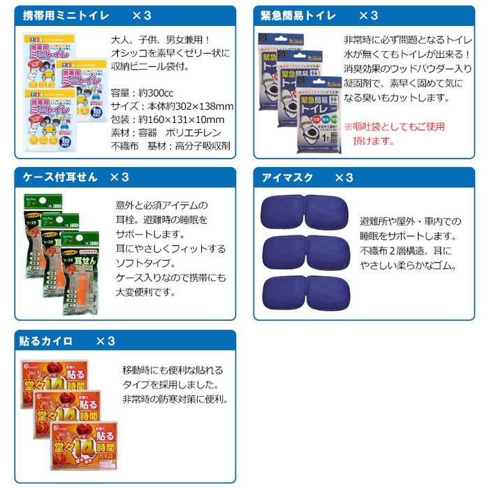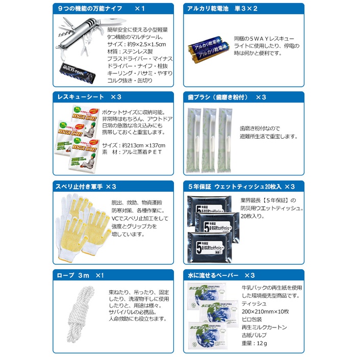 세트 내용 수량 피라미드 백 15WAY구출 라이트 110년 보존 수【500ml】 3 프리즈드라이(freezed dry) 비스켓 3구급 세트(aid 크루) 1 긴급 간이 화장실1회용 남녀 겸용 3 휴대용 미니 화장실 3 구출 씨트 3 제균Wet 티슈 3수에 흘려 보내는 페이퍼 3 한 번 쓰고 버려 붙이는 카이로 3방위 자석&whistle부 화타돌 1케이스 첨부이전 3아이마스《구》 3 로프 1 알카리 건전지단3 3만능 나이프 1칫솔 세트 「일본제」 3목장갑(《스베리》지 첨부(부)) 3
