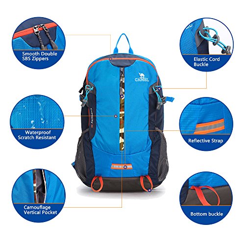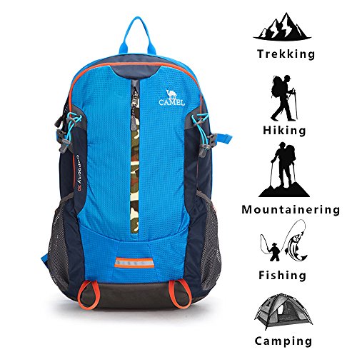 -. Brand : Camel -. Feature : ★MATERIAL ----High quality thickened fabric and 150D oxford waterproof coating, with waterproof, scratch resistant and anti tear characteristics, makes the bag more durable. / ★COMFORTABLE DAYPACK ----Breathable mesh shoulder straps with plentiful sponge padding help relieve the stress from your shoulder. Widened and thickened S-type shoulder straps and high elastic breathable back support for best ventilation and easing burden. / ★DIMENSIONS ----34 x 18 x 50.5cm.Lightweight (0.65kg) and Roomy(30Liters). / ★MULTIPURPOSE ----The backpack is suitable for everyday use, vacation, travel, hiking, school, climbing,cycling and shopping. It is also a great gift for family and friends. / ★WARRANTY ----Free return within one year, if you have any questions, please do not hesitate to contact us. -. Label : CAMEL -. Manufacturer : CAMEL -. ProductGroup : Sports -. ProductTypeName : OUTDOOR_RECREATION_PRODUCT -. Publisher : CAMEL -. Studio : CAMEL -. Title : Camel 30L Travel Backpack Waterproof Hiking Backpack Outdoor Backpack Lightweight and Durable
