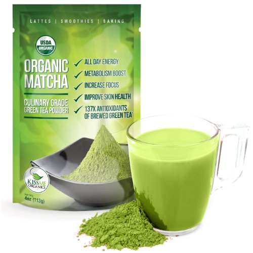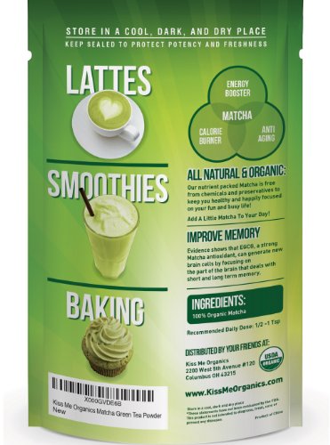 - Feature : ALL DAY ENERGY & FOCUS: Lift your vitality and concentration with the slow release natural energy from Organic Matcha / CALORIE BURNING BOOSTER: Support your weight loss goals with an all-natural way to increase your body's metabolism / LATTES | SMOOTHIES | BAKING: Kiss Me Organics Matcha Green Tea Powder arrives in an easy-to-use airtight health grade packaging allowing for as much or as little use as you need for any occasion. Enjoy a relaxing latte in the morning, bake a dozen cupcakes or simply add a small boost to your morning smoothie / 137x ANTIOXIDANTS OF BREWED GREEN TEA: USDA Organic Matcha Green Tea can only be used in a powdered form because, unlike brewed green tea, it contains the entire tea leaf which dramatically increases the nutritional content. / FREE MATCHA RECIPE GUIDE EBOOK WITH PURCHASE: 50+ Recipes All Yours - Emailed After Purchase.