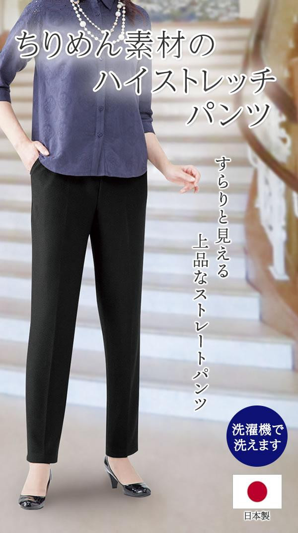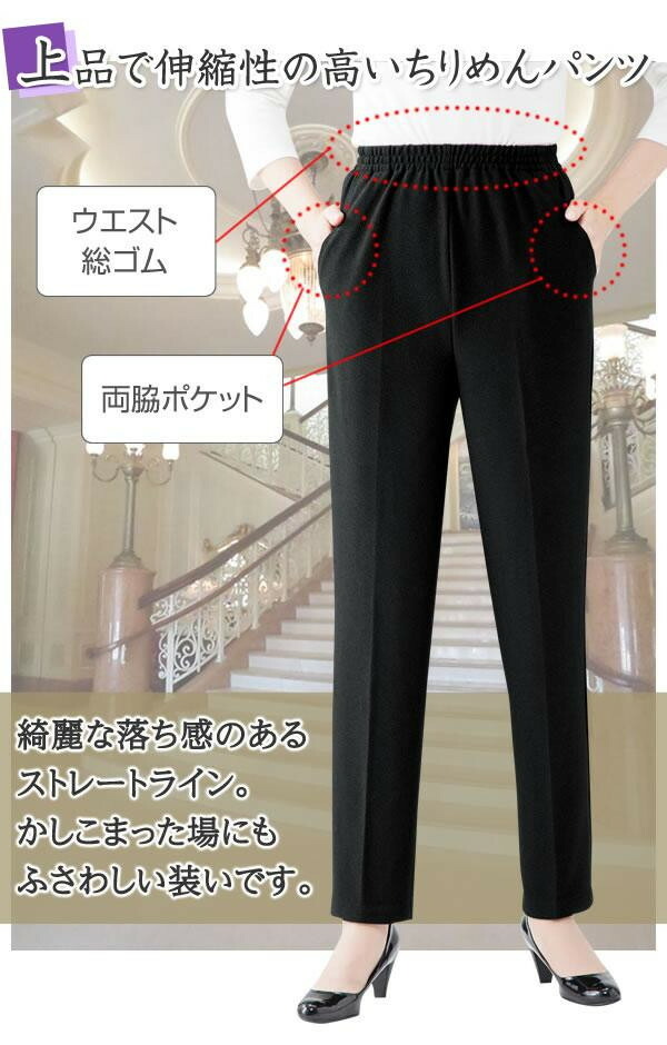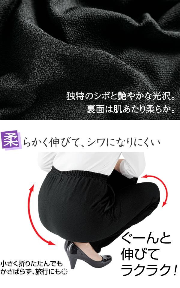 | <h1>落ち感の綺麗なストレートラインで上品にはける、柔らかなちりめん生地のパンツ。とってもよく伸びてノンストレス!小さくたためてシワも目立たないので、旅行にも◎。ちりめん/CHIRIMEN/和風/ストレート/黒パンツ/国産/日本製/MADE IN JAPAN/フォーマル/ストレッチ/のびのび/ゴム/柔らかい/やわらかい/旅行/携帯/持ち運び/コンパクト/シワになりにくい</h1> |